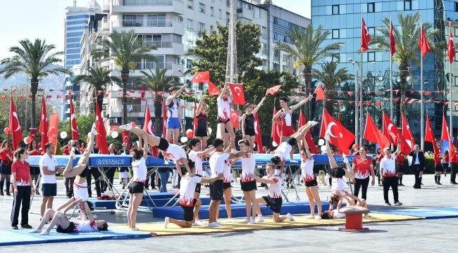 İzmir Valisi Erol Ayyıldız, İzmir Büyükşehir Belediye Başkanı Tunç Soyer, eşi Neptün Soyer ve Ege Ordusu Komutanı Orgeneral Abdullah Recep ile eşi Alev Recep'in de katıldığı tören renkli ve coşkulu geçti. 100. yıl coşkusunu doyasıya yaşamak isteyen İzmirliler Türk bayrakları ile Cumhuriyet Meydanı'na akın ettiler. Gençlik Spor İl Müdürlüğü çelenginin Atatürk anıtına koyulmasının ardından saygı duruşu ve İstiklal Marşı okundu, öğrenciler tarafından sahnelenen dans ve akrobasi gösterileri ise büyük ilgi topladı.