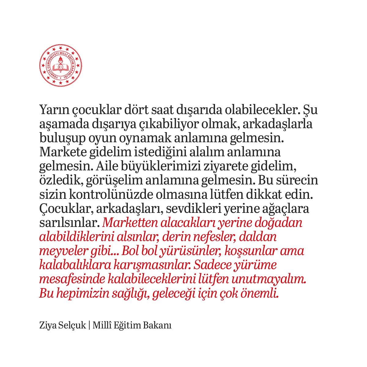 Milli Eğitim Bakanı Ziya Selçuk, Twitter hesabından, sokağa çıkma kısıtlaması bulunan 14 yaş altı çocukların bugün 11.00-15.00 saatleri arasında dışarı çıkışına izin verilmesiyle ilgili değerlendirmede bulundu.