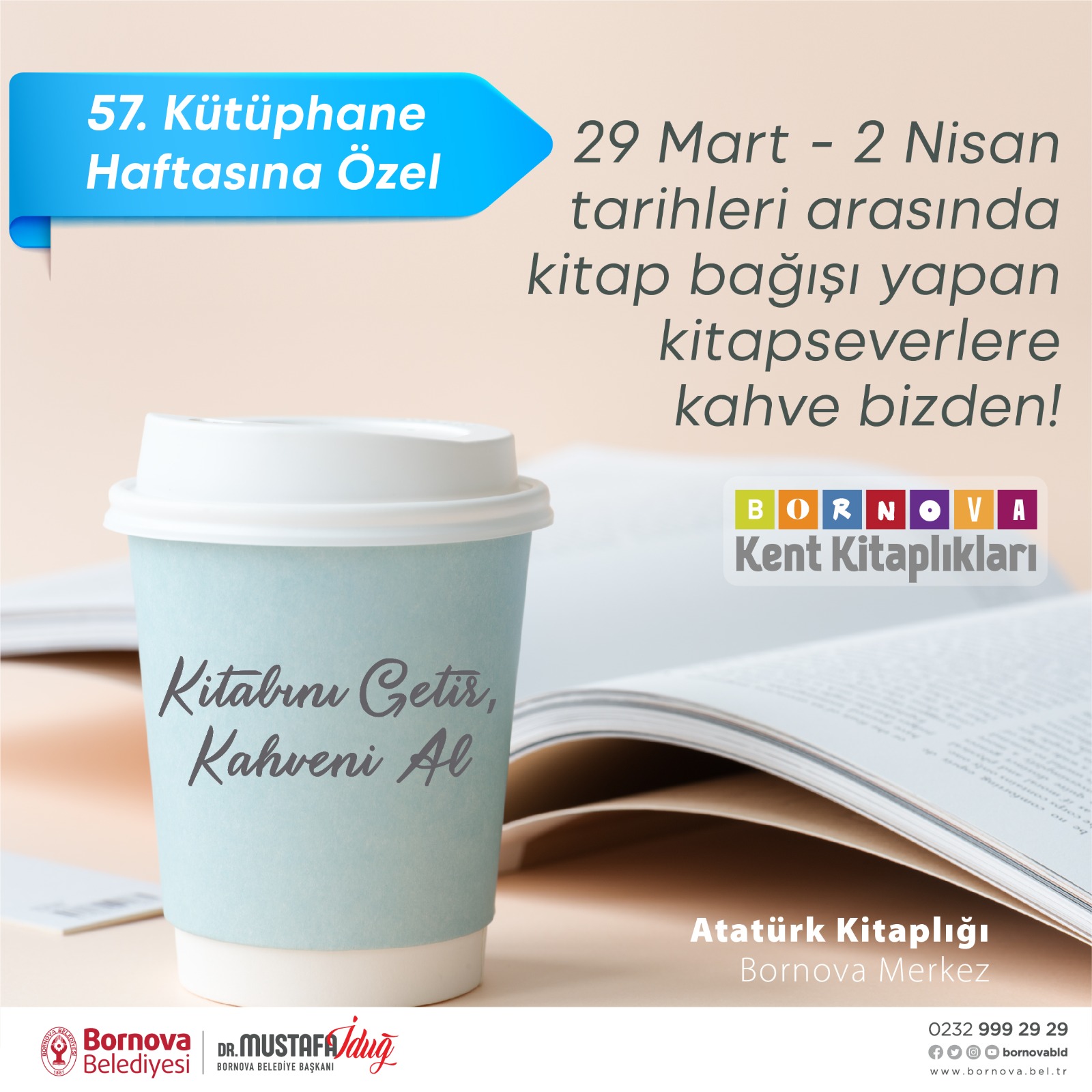 Atatürk Kitaplığı’nda hazırlanan organizasyonda Pandemi süresince evlerinde sıkılan çocuklara renkli bir gün yaşatıldı. Etkinlikte ilk olarak Olten Filarmoni ile ‘Müziğe Dair’ adlı dinleti yapıldı. Ardından Çocuk kitapları yazarı Ayşegül Yargın çocuklarla birlikte oldu. Miniklerle oyun oynayarak söyleşi yapan Yargın, ‘Bu Çocuk Bir Değişik’ adlı kitabını da anlattı. Yaratıcı Okuma etkinliğinde ise Merve Tandoğan Çalışkan 4-12 yaş arası çocuklarla buluştu. ‘Matthew’in Rüyası” adlı çocuk kitabını minikler için seslendirdi. Kitabını Getir Kahveni Al Vatandaşlardan gelen kitap bağışlarını da kabul eden Bornova Belediyesi, 57. Kütüphaneler Haftası çerçevesinde Kitabını Getir Kahveni Al başlıklı bir kampanya da başlattı. 29 Mart – 2 Nisan tarihleri arasında Bornova Merkez’de bulunan Atatürk Kitaplığı’na yapılan kitap bağışında vatandaşlara kahve ikramında bulunuyor. 57. Kütüphaneler Haftasını kutlayan Bornova Belediye Başkanı Dr. Mustafa İduğ, “İçinde bulunduğumuz dijital çağda çocukları okumaya teşvik etmek ve kitap sevgisi aşılamak çok önemli. Bizde bu amaçla çeşitli etkinlikler hayata geçiriyoruz. Belediyemiz bünyesinde Bornova'nın farklı noktalarında 8 kitaplığımız bulunuyor. Bu kitaplıklar sayesinde okumaya teşvik ederken, öğrencilerimize de ders çalışabilecekleri ortam yaratıyoruz” dedi. Etkinliklerde çocuklara kitap ve boya kalemleri dağıtan Bornova Belediye Başkan Yardımcısı Barbaros Taşer ise kitap okumanın öneminden bahsederek kütüphane kültürünün yaşatılması gerektiğini dile getirdi.