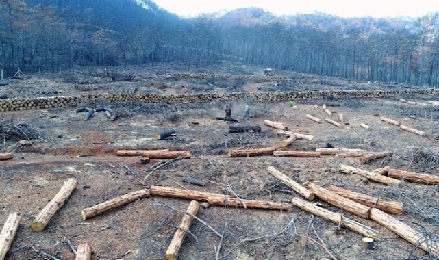 Muğla'nın 9 ilçesinde 29 Temmuz 2021 tarihinde başlayan orman yangınları sonucu 52 bin hektar yanan alanlarda ağaçların kesim ve taşıma işleri 15 aydır bitirilemedi. Şu ana kadar 5 milyon metreküp ağaç kesildi. Kesim işlerinde 15 bin kişi çalışıyor. Ulaşımın olmadığı zirvelerde kalan yanan ağaçlar ise doğaya terk edilecek.İlçeler arasında 13 bin 600 hektar ormanı yanan Marmaris ilk sırada yer alırken adeta 6 Ağustos 1945’te atom bombası ile vurduğu Japonya’nın Hiroşima ve Nagasaki kentlerindeki görünümü yansıtan kömür deryası dağları görenler şimdi de kesilmiş ağaç tomruklarını görerek nefret duygularını gizleyemiyor. Yeşiliyle ünlü Marmaris'ten geriye kalan görüntüler yürek burkuyor. Neredeyse arıcılık, tarım, hayvan yetiştiriciliği bitme noktasına geldi.