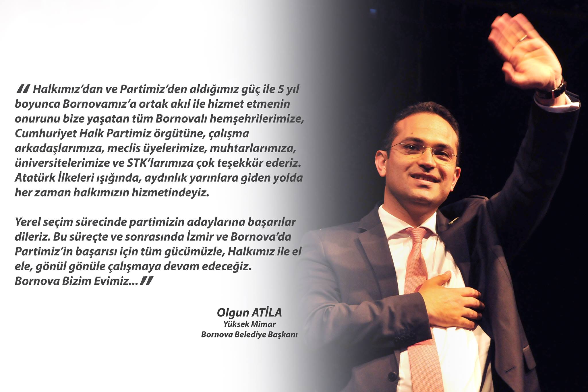 CHP'de gerçekleşen Parti Meclisi toplantılarının aldığı karar ile Bornova'da değişikliğe gidilmişti. Mevcut Belediye Başkanı Olgun Atila'nın yerine Mustafa İduğ aday gösterilmişti.Aday belirleme sürecinde CHP'den başkan adayı gösterilmeyen bornova Belediye Başkanı Olgun Atila, sessizliğini bozarak sosyal medya üzerinden açıklamada bulundu.İşte o açıklama:
