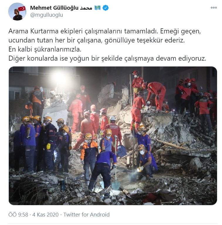 "Arama kurtarma ekipleri çalışmalarını tamamladı. Emeği geçen, ucundan tutan her bir çalışana, gönüllüye teşekkür ederiz. En kalbi şükranlarımızla. Diğer konularda ise yoğun bir şekilde çalışmaya devam ediyoruz."