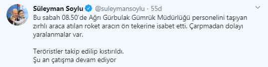 Saldırı ile ilgili olarak Twitter'dan açıklama yapan İçişleri Bakanı Süleyman Soylu, saldırının 08.50'de meydana geldiğini ve roketin Gürbulak Gümrük müdürlüğü personelini taşıyan zırhlı aracın ön tekerine isabet ettiğini bildirdi.