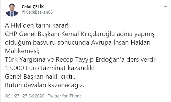 AİHM, Erdoğan'ın Türkiye'de açtığı davalar yüzünden para cezasına mahkum olan Kılıçdaroğlu’nun avukatı Celal Çelik’in yaptığı başvuruda, Türkiye'nin Avrupa İnsan Hakları Sözleşmesi’nin (AİHS) ifade özgürlüğü hakkının korunmasıyla ilgili 10. maddesinin ihlal ettiğine hükmetti. AİHM kararı gereği Türkiye, Kılıçdaroğlu’na yaklaşık 13 bin avro tazminat ödeyecek.