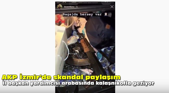AKP Çocukları adlı sosyal medya hesabının daha önce duyurduğu AKP İzmir’in yönetim kurulu üyelerinin yaşadığı lüks hayatlar çıkan görüntülerle gündeme oturmuştu. Arkadaşları ile birlikte lüks aracıyla trafik terörü yaşatanlardan biri olan AKP İzmir İl Başkan Yardımcısı Levent Duru Başaran bir skandala daha imza attı. Başaran kendi sosyal medya hesabından video yayınlayarak arabasının arkasında yer alan uzun namlulu silah olan ‘kalaşnikof’u göstererek “burada her şey varmış” diyerek görüntüyü paylaştı.