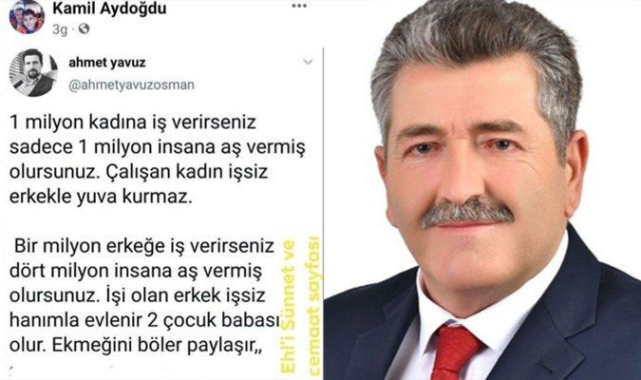 Yenişehir Belediyesi AKP'li Meclis Üyesinin çalışan kadınlara yönelik paylaşımı tepkilere neden oldu.PAYLAŞIM TEPKİ ÇEKTİBursa Yenişehir Belediyesi AKP'li Meclis Üyesi Kâmil Aydoğdu, çalışan kadınlara yönelik bir paylaşımı alıntılayarak kendi sosyal medya hesabından paylaştı.Aydoğdu’nun tepki çeken paylaşımı ise şöyle:* 1 milyon kadına iş verirseniz sadece 1 milyon insana aş vermiş olursunuz. Kadın işsiz erkekle yuva kurmaz.* Bir milyon erkeğe iş verirseniz dört milyon insana aş vermiş olursunuz. İşi olan erkek işsiz hanımla evlenir 2 çocuk babası olur. Ekmeğini böler paylaşır.