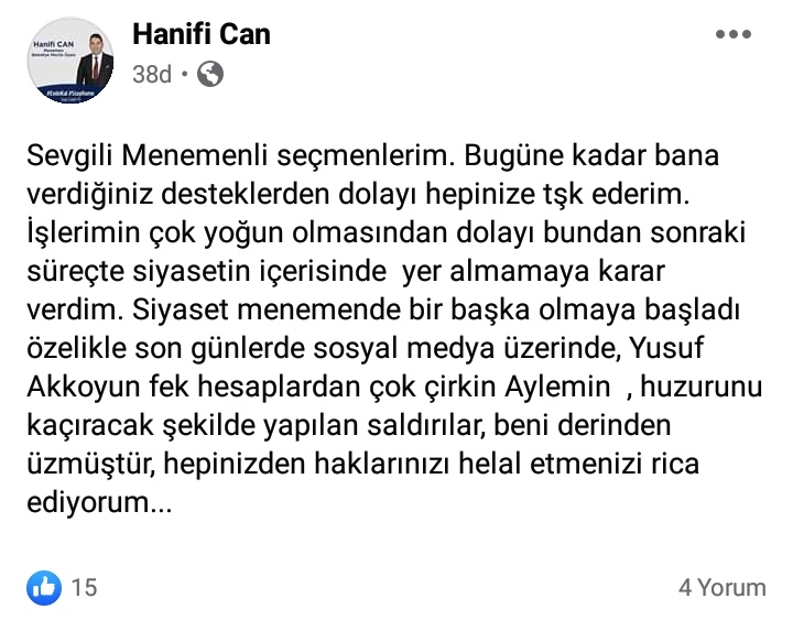 "Sevgili Menemenli seçmenlerim. Bugüne kadar bana verdiğiniz desteklerden dolayı hepinize tşk ederim. İşlerimin çok yoğun olmasından dolayı bundan sonraki süreçte siyasetin içerisinde yer almamaya karar verdim. Siyaset menemende bir başka olmaya başladı özelikle son günlerde sosyal medya üzerinde, Yusuf Akkoyun fek hesaplardan çok çirkin Aylemin , huzurunu kaçıracak şekilde yapılan saldırılar, beni derinden üzmüştür, hepinizden haklarınızı helal etmenizi rica ediyorum..."