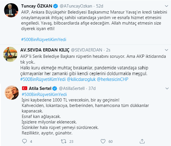 Twitter'da gündem olan hastag üzerinden CHP İzmir Milletvekilleri de duruma tepki göstermede gecikmedi. Tuncay Özkan, Ankara Belediye Başkanı Mansur Yavaş'ın belediye meclisinden geçirmek istediği hizmetlerinin engellemesine atıfta bulunurken Sevda Erdan Kılıç "halkı kuru ekmeğe muhtaç bırakanlar, kendi ceplerini dolduruyor" dedi. Atila Sertel ise "işsizlere milyonlar eklenecek, sizinkiler hala rüşvet yemeyi sürdürecek" diyerek tepkisini gösterdi.
