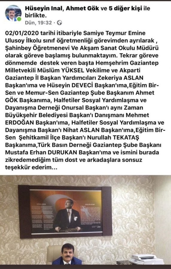 Antep’te Şahinbey Öğretmenevi ve Akşam Sanat Okulu Müdürlüğü’ne atandıktan sonra kendisine destek olan AKP’li isimlere sosyal medyadan teşekkür eden ve eski akp Antep Milletvekili Şamil Tayyar tarafından gündeme getirilen Hüseyin İnal, görevinden alındı.