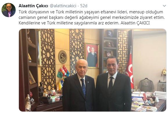 Görüşmenin MHP Genel Merkezi'nde gerçekleştiğini belirten Çakıcı, "Türk dünyasının ve Türk milletinin yaşayan efsanevi lideri, mensup olduğum camianın genel başkanı, değerli ağabeyimi genel merkezimizde ziyaret ettim. Kendilerine ve Türk milletine saygılarımla arz ederim" dedi.