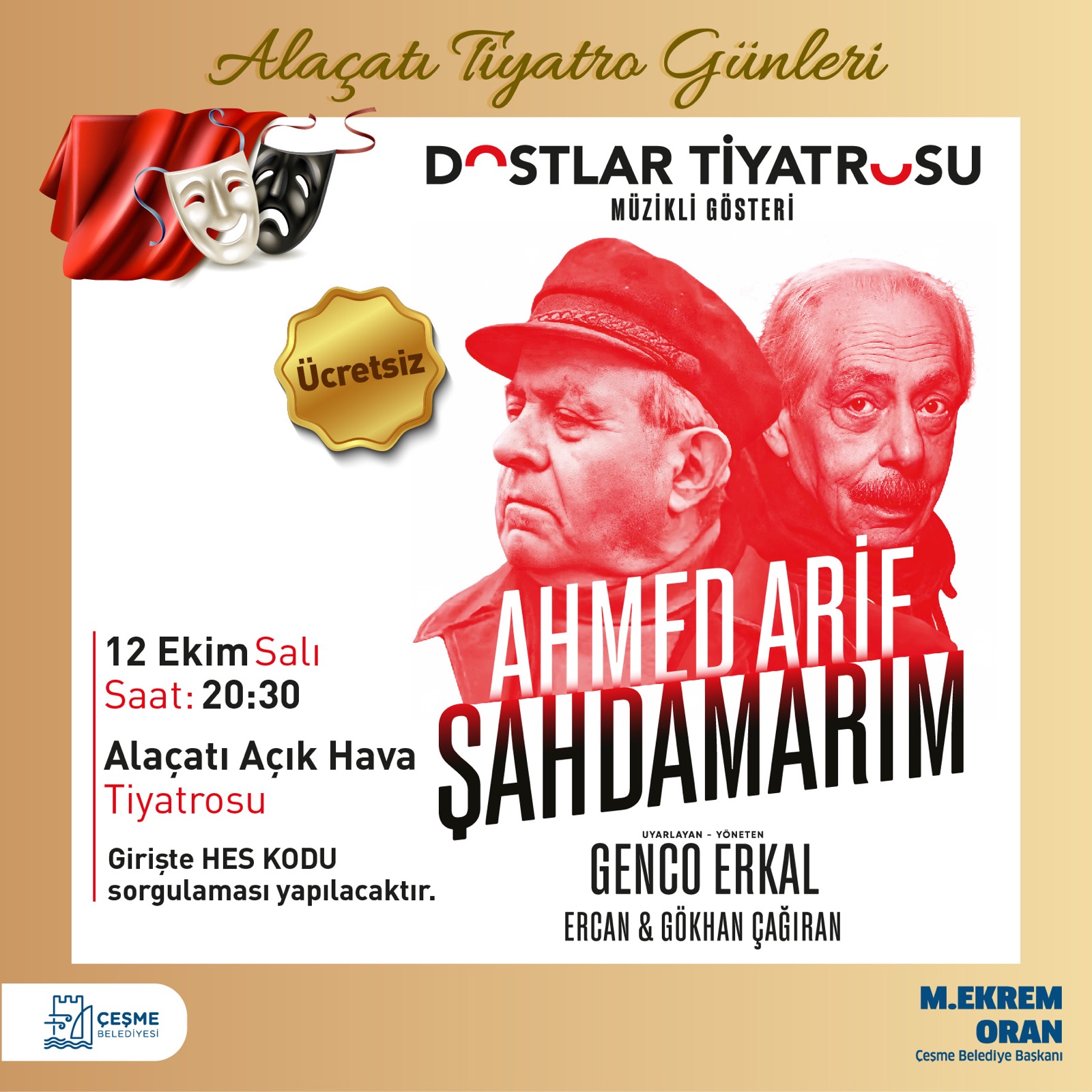12 Ekim Salı günü, Genco Erkal, Ahmet Arif’i anlatacağı yeni oyunu Şahdamarım ile Çeşmeli izleyicilerle buluşacak. Tek bir şiir kitabıyla edebiyatımızın zirvesini tutmuş, halk kitlelerince en sevilen yazarların başında gelen büyük ozan Ahmet Arif’in ölümünün 30. yılında onun anısına düzenlenen Şahdamarım’da onun şiirlerinden bestelenen şarkıları sahnede Ercan ve Gökhan Çağıran kardeşler yorumlayacak.