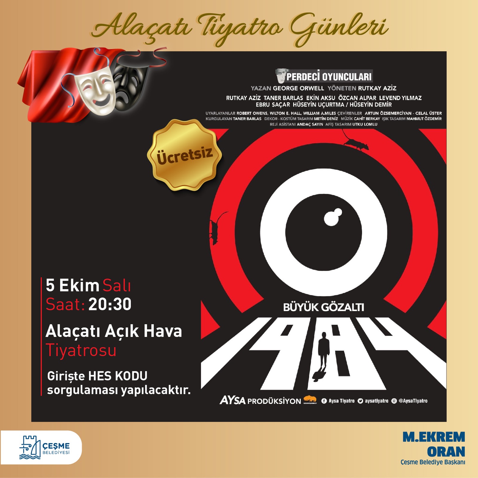 Alaçatı Tiyatro Günleri kapsamında 5 Ekim Salı günü Rutkay Aziz’in yönettiği, Taner Barlas’ın kurguladığı 1984 (Büyük Gözaltı) George Orwell’in kült romanı 1984’teki distopyayı tiyatro sahnesine taşıyor.