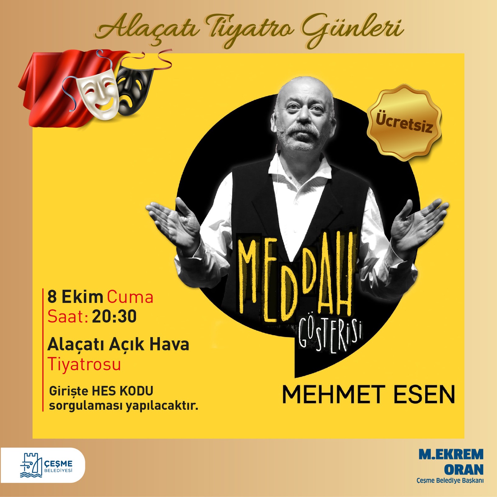 8 Ekim Cuma günü Meddah kültürünün son temsilcisi usta oyuncu Mehmet Esen’in tek kişilik gösterisi Çeşmeli sanatseverler ile buluşacak.