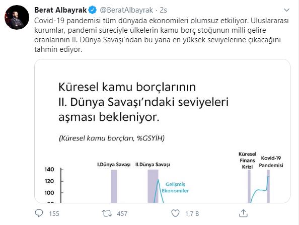 Albayrak, uluslararası kurumların, pandemi süreciyle ülkelerin kamu borç stokunun milli gelire oranlarının 2. Dünya Savaşı'ndan bu yana en yüksek seviyelerine çıkacağını tahmin ettiğini belirtti.