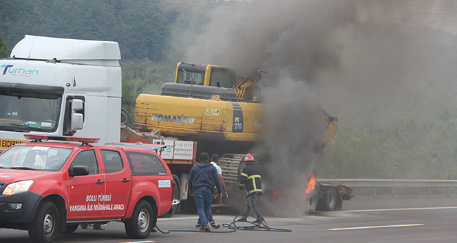 Düzce TEM otoyolu Kaynaşlı mevki'inde iş makinesi yüklü tır’ın lastikleri alev aldı. Yangına ilk olarak yoldan geçen kamyon şoförleri yangın tüpü ile müdahale etti.