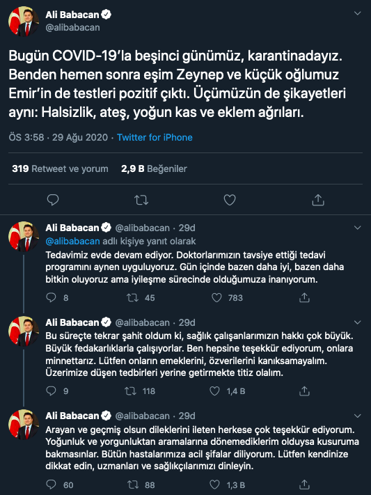 Bu süreçte tekrar şahit oldum ki, sağlık çalışanlarımızın hakkı çok büyük. Büyük fedakarlıklarla çalışıyorlar. Ben hepsine teşekkür ediyorum, onlara minnettarız. Lütfen onların emeklerini, özverilerini kanıksamayalım. Üzerimize düşen tedbirleri yerine getirmekte titiz olalım.