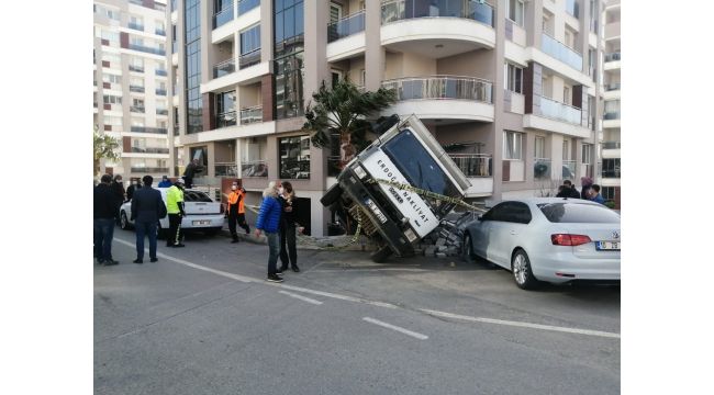 Kaza, Aliağa ilçesi Siteler Mahallesi'nde meydana geldi. Edinilen bilgiye göre, E.Y. (35) idaresindeki 35 F 2273 plakalı parke taşı yüklü kamyon durakladığı esnada freni boşaldı. Bu sırada direksiyondaki kamyon sürücüsü ne yaptıysa aracı durduramadı. Hızla giden kamyon, 2 araca çarptı, ardından bir binanın istinat duvarını yıktı. Kamyon, ardından da yan yatarak asılı kaldı. Meydana gelen feci kazada faciadan dönülürken, kamyon sürücüsü Erkan Y. kazayı hafif sıyrıklarla atlattı.