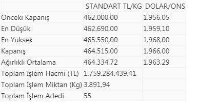 KMKTP'de, altında gerçekleşen toplam işlem hacmi 1 milyar 759 milyon 284 bin 439,41 lira, işlem miktarı ise 3.891,94 kilogram oldu. Tüm metallerdeki toplam işlem hacmi ise 1 milyar 788 milyon 367 bin 949,26 lira oldu.