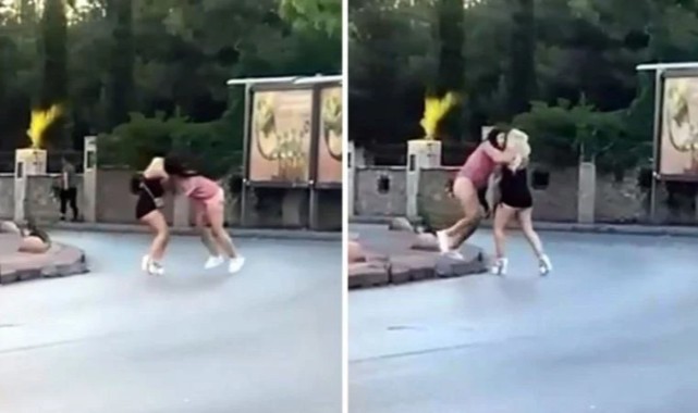 Bilinmeyen bir nedenle kavga eden iki kadından biri, diğerini darbedip yerde tekmeledi. Kadınların saç saça baş başa kavgası, çevredeki bir vatandaşın cep telefonu kamerası tarafından kaydedildi.