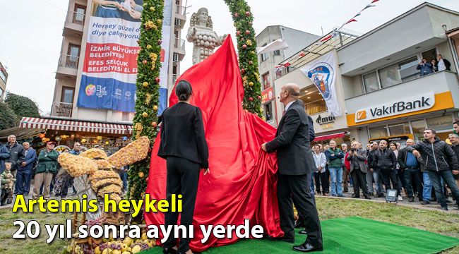 Efes Selçuk’un simgelerinden Artemis heykelinin 20 yıl önce bulunduğu yere yeniden konulması nedeniyle ayrı bir tören düzenlendi. Heykelin birebir bir kopyasının açılışında konuşan Tunç Soyer, 20 yıl önce kaldırılan heykelin, aynı yerde, yeniden kent meydanıyla buluşmasından dolayı heyecan duyduğunu belirtti. Soyer konuşmasında, “Bugün sadece Efes Selçuk için değil, tüm İzmir için çok önemli olan Güzel Artemis Heykeli’nin yeniden kent meydanıyla buluşması, hepimizi çok heyecanlandırıyor. Adına dünyanın 7 harikasından biri olan Artemis Tapınağı inşa edilen Efesli Artemis, Antik Efes’i bir dünya kenti yaparak zenginleşmesini sağlamış, bu coğrafyanın en önemli değerlerinden biridir” dedi. Artemis heykelinin kentin belleğinin bir parçası olduğuna dikkat çeken Filiz Ceritoğlu Sengel ise &ld quo;Artemis'i tekrar bu meydana dikelim ki herkes buranın Artemis'in bereketli elinin değdiği topraklar olduğunu bilsin” şeklinde konuştu.