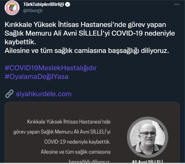 Ali Avni Silleli, yapılan tüm müdahalelere rağmen kurtarılamadı. Silleli’nin vefat haberi, başta ailesi ve yakınları olmak üzere sağlık camiasında büyük üzüntüye sebep oldu.TTB'nin yaptığı paylaşımda şöyle denildi:Kırıkkale Yüksek İhtisas Hastanesi'nde görev yapan Sağlık Memuru Ali Avni SİLLELİ'yi COVID-19 nedeniyle kaybettik. Ailesine ve tüm sağlık camiasına başsağlığı diliyoruz.
