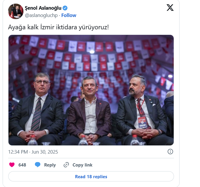 Karar sonrası CHP'li isimlerden karara peş peşe tepkiler gelmeye devam ederken, İzmir İl Başkanı Şenol Aslanoğlu'ndan dikkat çeken bir paylaşım geldi.CHP Genel Başkanı Özgür Özel, İzmir Büyükşehir Belediye Başkanı Cemil Tugay ve kendisinin bulunduğu bir fotoğrafı sosyal medya hesabında paylaşan Aslanoğlu," Ayağa kalk İzmir iktidara yürüyoruz!" ifadelerini kullandı.Aslanoğlu'nun paylaşımı şu şekilde;