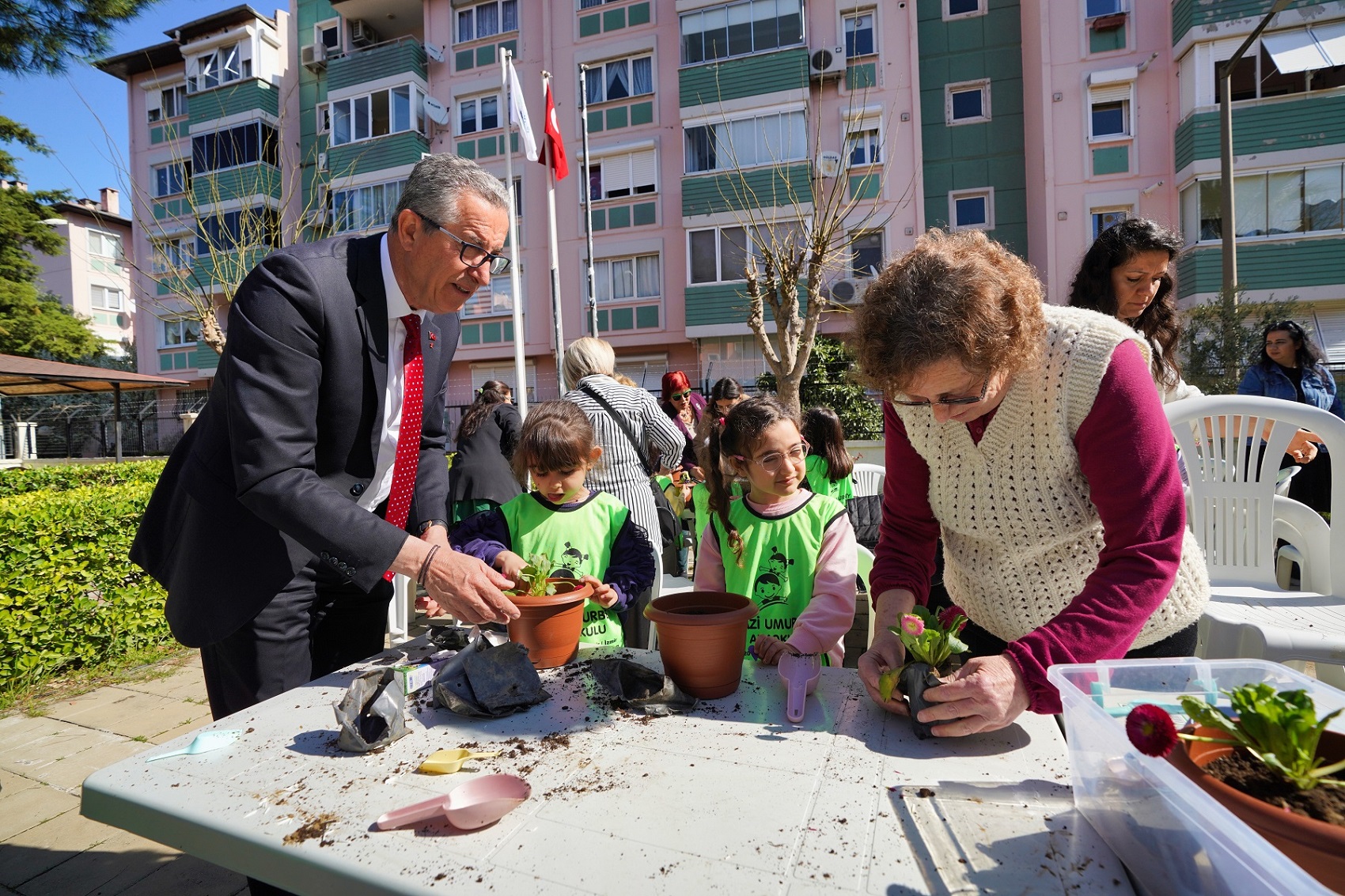 Gaziemir Belediyesi’nin, ilçede yaşayan 60 yaş üstü vatandaşların evlerinden çıkıp sosyalleşmeleri, mutlu ve sağlıklı bir yaşam sürmeleri için hizmet verdiği Ata Evi Sağlıklı Yaş Alma Merkezi, kuşaklararası köprü görevi de görüyor. Ata Evi’nde düzenlediği etkinliklerde yaş almış yurttaşlar ile gençleri bir araya getiren belediye, Yaşlılara Saygı Haftası’nda da özel bir etkinlik düzenledi. Etkinlikte, Ata Evi’nin üyeleri ile Gazi Umurbey Anaokulu’nun öğrencileri bir araya geldi. Belediye Başkanı halil arda ile Okul Müdürü Dilara Kaplan ve öğretmenlerin de katıldığı etkinlikte fidanlar ile çınarlar, saksılara çiçek diktiler. Minik öğrenciler, diktikleri çiçekleri Ata Evi üyelerine armağan ettiler.