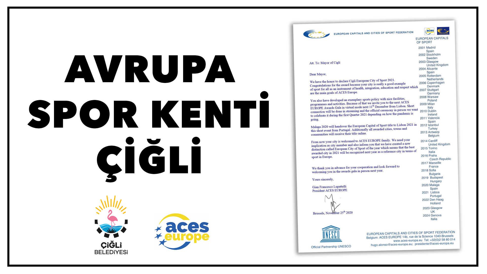 Çiğli Belediyesi’ne gönderilen resmi yazıda Çiğli’nin resmi olarak 2021 Avrupa Spor Kenti olduğu ilan edildi. Duyuru ve tebrik mahiyetindeki mektupta ayrıca Çiğli’deki sportif özellikleri açısından sağlık, entegrasyon, eğitim ve uyum gibi konularda ACES Europe’un ana hedeflerine son derece uygun olduğu da belirtildi. Böylece Çiğli Belediyesi, İzmir’de “Avrupa Spor Kenti” ödülünü alan ilk belediye olarak önemli bir başarıya imza attı.