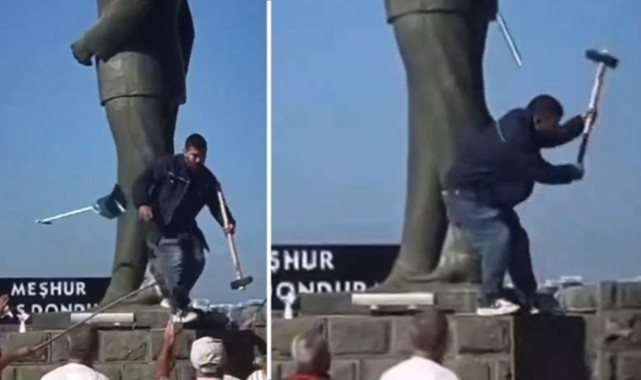 Ayvalık'ta kimliği belirsiz bir şahıs balyozla Atatürk Anıtı'na saldırdı. Çevredeki yurttaşların engellediği şahıs polis tarafından gözaltına alındı.Balıkesir'in Ayvalık ilçesinde kimliği belirsiz bir şahıs Atatürk Anıtı'na saldırdı. Balyozla anıta vuran şahıs, etraftaki yurttaşlar tarafından engellendi. Çevredekiler, şahsa ellerindeki süpürge ve çöp kovalarıyla müdahale etti. Daha sonra büstten indirilen şahıs, polisin olaya müdahale etmesinin ardından gözaltına alındı.