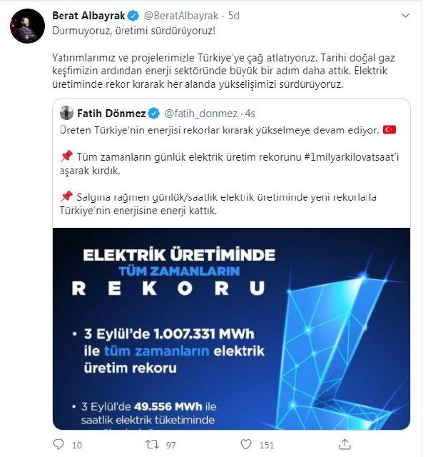 Bakan Albayrak, Twitter hesabından Enerji ve Tabii Kaynaklar Bakanı Fatih Dönmez'in yaptığı, "Üreten Türkiye'nin enerjisi rekorlar kırarak yükselmeye devam ediyor. Tüm zamanların günlük elektrik üretim rekorunu 1 milyar kilovatsaati aşarak kırdık. Salgına rağmen günlük/saatlik elektrik üretiminde yeni rekorlarla Türkiye'nin enerjisine enerji kattık" açıklamasını tekrar paylaştı.