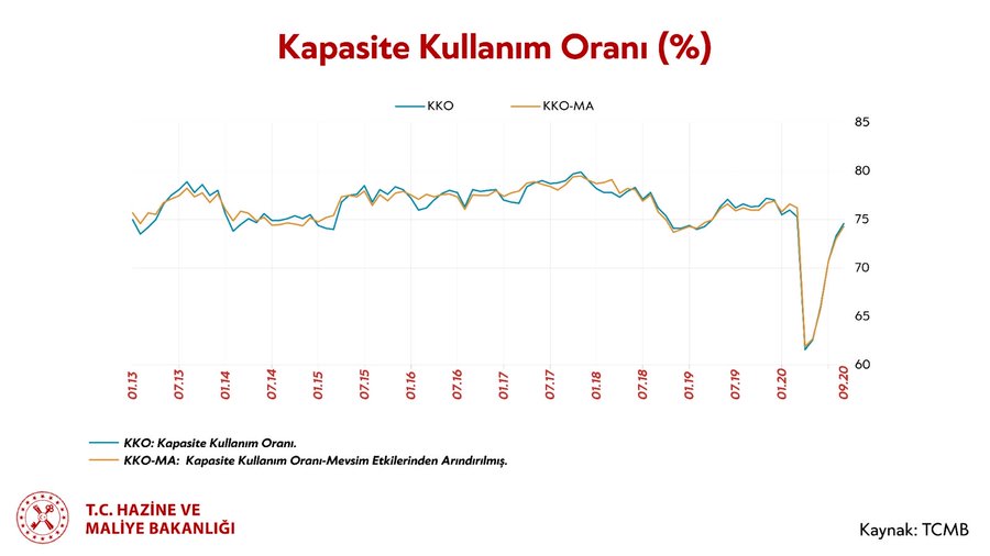 ''Yılın üçüncü çeyreğine ilişkin son veriler olumlu gelmeye devam ediyor! Mevsim etkilerinden arındırılmış Kapasite Kullanım Oranı, Eylül ayında 1.3 puan artarak \%74,6 seviyesine çıktı. İnşaallah son çeyrekte de bu seyir devam edecek ve yılı beklentilerin üzerinde tamamlayacağız''