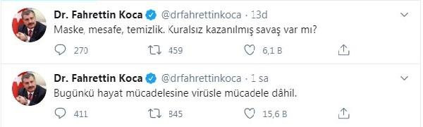 Bakan Koca, sosyal medya Twitter hesabından, corona virüsü tedbirlerine dikkat çekmek amacıyla iki paylaşımda bulundu.