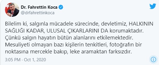 Koca, şunları söyledi; "Bilelim ki, salgınla mücadele sürecinde, devletimiz, HALKININ SAĞLIĞI KADAR, ULUSAL ÇIKARLARINI DA korumaktadır. Çünkü salgın hayatın bütün alanlarını etkilemektedir. Mesuliyeti olmayan bazı kişilerin tenkitleri, fotoğrafın bir noktasına mercekle bakıp, leke aramaktan farksızdır."