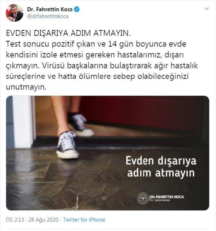 Bakan Koca, Twitter hesabından yaptığı açıklamada, "Evden dışarıya adım atmayın. Test sonucu pozitif çıkan ve 14 gün boyunca evde kendisini izole etmesi gereken hastalarımız, dışarı çıkmayın. Virüsü başkalarına bulaştırarak ağır hastalık süreçlerine ve hatta ölümlere sebep olabileceğinizi unutmayın" dedi.