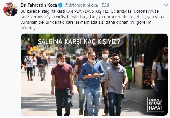 Bakan Koca, resmi sosyal medya hesabından sokakta yürüyen beş gencin fotoğrafını paylaştı. Fotoğrafta önde bulunan 3 gencin maskelerini çene altında taşıdıklarını görüldü. Bakan Koca'da sosyal medya hesabından yaptığı paylaşımda "Bu karede, salgına karşı ön planda 5 kişiyiz. Üç arkadaş, koronavirüse taviz vermiş. Oysa virüs, biriyle karşı karşıya dururken de geçebilir, yan yana yürürken de. Bir dahaki karşılaşmamızda sizi daha donanımlı görelim arkadaşlar" ifadelerine yer verdi.