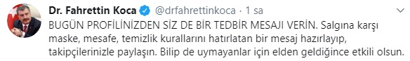 "Bugün profilinizden siz de bir tedbir mesajı verin. Salgına karşı maske, mesafe, temizlik kurallarını hatırlatan bir mesaj hazırlayıp, takipçilerinizle paylaşın. Bilip de uymayanlar için elden geldiğince etkili olsun."