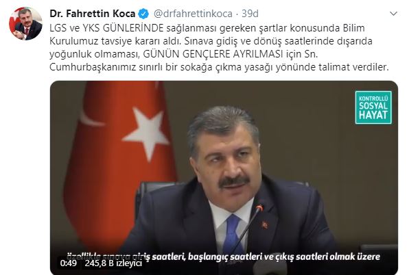 Bakan Koca şunları söyledi:"LGS ve YKS günlerinde sağlanması gereken şartlar konusunda Bilim Kurulumuz tavsiye kararı aldı. Sınava gidiş ve dönüş saatlerinde dışarıda yoğunluk olmaması, günün gençlere ayrılması için Cumhurbaşkanımız sınırlı bir sokağa çıkma yasağı yönünde talimat verdiler"