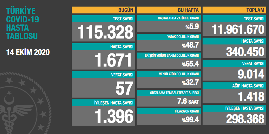 Fahrettin Koca'nın yaptığı açıklamaya göre Türkiye'de koronavirüsten 57 kişi daha hayatını kaybetti. 1671yeni 'hasta' var.