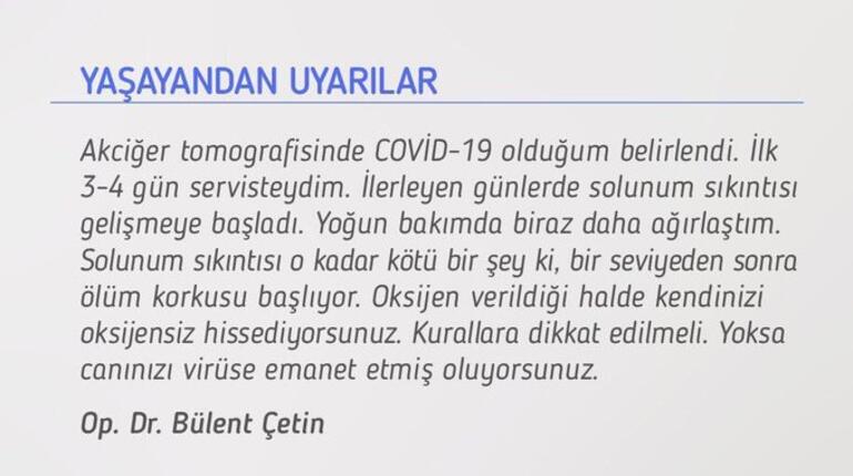 "Akciğer tomografisinde Kovid-19 olduğum belirlendi. İlk 3-4 gün servisteydim. İlerleyen günlerde solunum sıkıntısı gelişmeye başladı. Yoğun bakımda biraz daha ağırlaştım. Solunum sıkıntısı o kadar kötü bir şey ki bir seviyeden sonra ölüm korkusu başlıyor. Oksijen verildiği halde kendinizi oksijensiz hissediyorsunuz. Kurallara dikkat edilmeli. Yoksa canınızı virüse emanet etmiş oluyorsunuz. Op. Dr. Bülent Çetin."