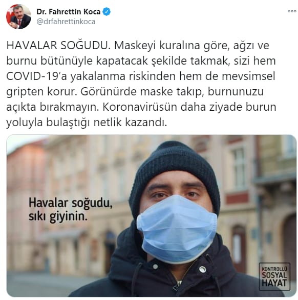 "Ağzı ve burnu bütünüyle kapatalım" uyarısı yapan Koca, şu ifadeleri kullandı:"HAVALAR SOĞUDU. Maskeyi kuralına göre, ağzı ve burnu bütünüyle kapatacak şekilde takmak, sizi hem COVID-19’a yakalanma riskinden hem de mevsimsel gripten korur. Görünürde maske takıp, burnunuzu açıkta bırakmayın. Koronavirüsün daha ziyade burun yoluyla bulaştığı netlik kazandı.