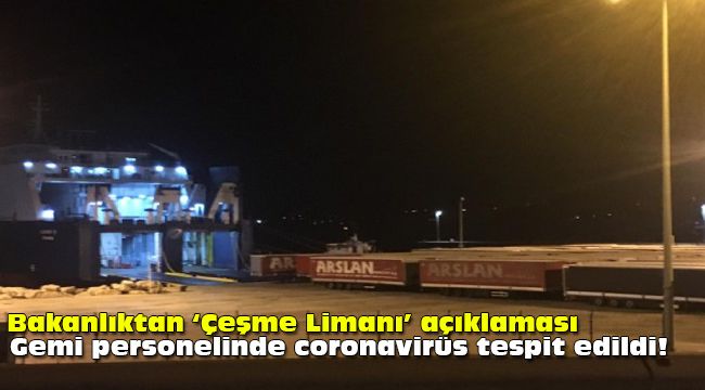 İddialara konu olan U15 RO-RO gemisinin 17 Mart tarihinde İtalya Trieste limanından hareket ederek, 20 Mart’ta saat 17.00’de Çeşme Limanı’na yanaştığı hatırlatılarak, “Geminin limana yanaşmasından önce tüm saha ve gemi kapakları steril edilmek üzere ilaçlanmıştır. Gemi ile herhangi bir yolcu ve sürücü gelmediği gibi, mürettebatın da karaya çıkmasına müsaade edilmemiştir. Çeşme Gümrük Müdürlüğünde, gemi limana yanaşmadan önce 17 Mart 2020 tarihinde ateşi tespit edilen 4 personel, Sağlık Bakanlığı Türkiye Hudut ve Sahiller Sağlık Genel Müdürlüğü Çeşme Sahil Sağlık Denetleme Merkezince hastaneye sevk edilmiş, yapılan test sonucunda 19 Mart 2020 tarihinde bir personelimizde virüs tespit edilmiştir. Diğer 3 personelin ilk testleri negatif çıkmış, hastanede gözetim sürecinde de yapılan ikinci testin de negatif çıkması üzerine, evde izolasyon sağlanacak şekilde taburcu edilmiştir. Test yapılan personelimizle yakın temas olasılığı olan 45 kişiye öncelikle karantina uygulanması kararı verilmiştir” ifadeleri kullanıldı.