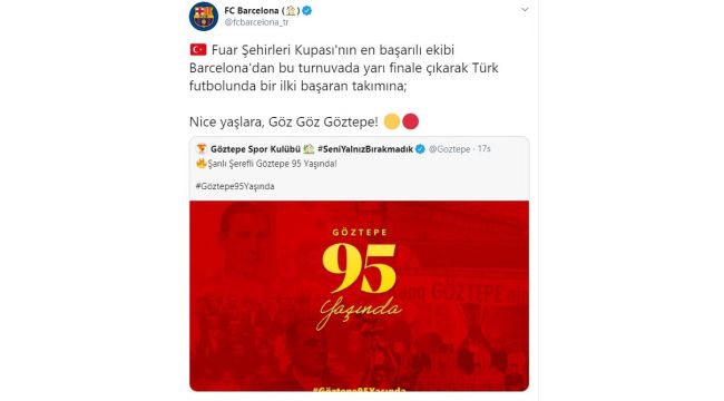 Barcelona Kulübü'nün Türkçe hesabı, yayınladığı paylaşımla Göztepe'nin kuruluşunun 95. yılını kutladı.