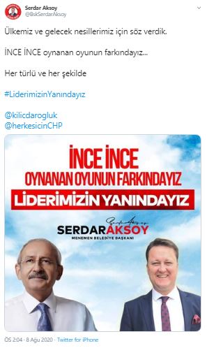 Menemen Belediye Başkanı Serdar Aksoy sosyal medya hesabından manidar bir paylaşımda bulundu. Muharrem İnce'nin yeni parti kuracağı iddialarının gündemde olduğu bir dönemde Kemal Kılıçdaroğlu ve Kendisinin fotoğrafını paylaşan Serdar Aksoy "İnce ince oynanan oyunların farkındayız" dedi.