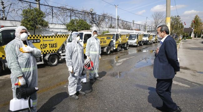Konak Belediyesi, Covid-19 salgını ile mücadele kapsamında temizlik ve dezenfektasyon çalışmalarını hız kesmeden sürdürürken, konak Belediye Başkanı abdül batur işçileri atölyelerinde ziyaret etti. Park ve Bahçeler, Temizlik ve Fen İşleri ekipleriyle bir araya gelen Başkan Batur, Korona ile mücadelede en ön cephede görev yapan belediye çalışanlarına moral verdi. Görevlerini yaparken kendi sağlıklarına özellikle dikkat etmeleri gerektiğin dikkat çeken Başkan Batur, maske ve eldiven kullanımının önemini hatırlatarak, “Vatandaşa hizmeti elbette aksatmayacağız ama önce kendi sağlığımızı korumamız lazım. Kimsenin tırnağına bile zarar gelsin istemiyorum. Onun için maskenizi, eldiveninizi mutlaka takın. Sağlık kurallarını, bakanlığın açıkladığı kuralları önemseyin ve uygulayın” dedi.