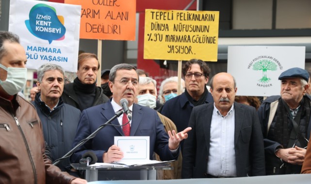 Basın açıklamasını Konak Kent Konseyi Başkanı Hamit Mumcu’nun okuduğu etkinlikte konuşan Başkan Batur, dünyadaki su kaynaklarının hızla tükendiğini ifade etti. Küresel ısınma ve diğer afetlerle doğanın ve dünyanın insanlığı uyardığını belirten Başkan Batur, “Tek evimiz olan dünya, yeryüzündeki hayatın tehlikede olduğunu anlatmak için her geçen gün daha da sert şekilde bizi uyarıyor. Su, dünyanın en önemli kaynağı. Su yoksa hayat da yok. Dünyanın su kaynakları süratle tükenirken, bizler tüm uyarılara rağmen ne yazık ki değerini tam olarak bilmiyoruz. Bugün tasarruf edeceğimiz bir damla suyun, dünyanın başka bir yerinde yaşam umudu olabileceğini ne yazık ki kavrayamıyoruz” dedi. “Su kaynaklarımızı tehdit edecek hiçbir adıma müsaade edilmemeli”Yerel yöneticiler olarak, özellikle su havzalarının korunması, buralardaki yapılaşmaya karşı durmaları gerektiğini vurgulayan Başkan Batur, İzmir Büyükşehir Belediyesi’nin Marmara Gölü’nün korunması, eski haline yeninden gelebilmesi için düzenlediği etkinliğin önemli olduğunu söyledi. Bu konudaki çalışmalarından ötürü İzmir Büyükşehir Belediye Başkanı Tunç Soyer’e ve Dünya Su Günü’nde görüşlerini ifade ederek suyun önemine dikkat çeken tüm oda başkanları ve çevreci kurumlara teşekkürlerini ileten Başkan Batur, sözlerini şöyle sürdürdü:“Dünyanın yüzde 70’i su, ancak bunun ancak yüzde 3’ü içilebilir tatlı su kaynağı. Ancak bu da sizi yanıltmasın. Çünkü bu yüzde 3’lük kaynağın da sadece yüzde 1’ine ulaşabiliyoruz. Su, hem en değerli hem de en kıt kaynağımız. Her damlasına kadar su kaynaklarımıza, her dalına kadar ağaçlarımıza, ormanlarımıza, her santimine kadar bereketli topraklarımıza sahip çıkmalıyız ki böylece gezegenimizi, böylece geleceğimizi de koruyabilelim. Bu hepimiz adına tarihi bir sorumluluktur. Su kaynaklarımızı tehdit edecek hiçbir adıma müsaade edilmemelidir.”
