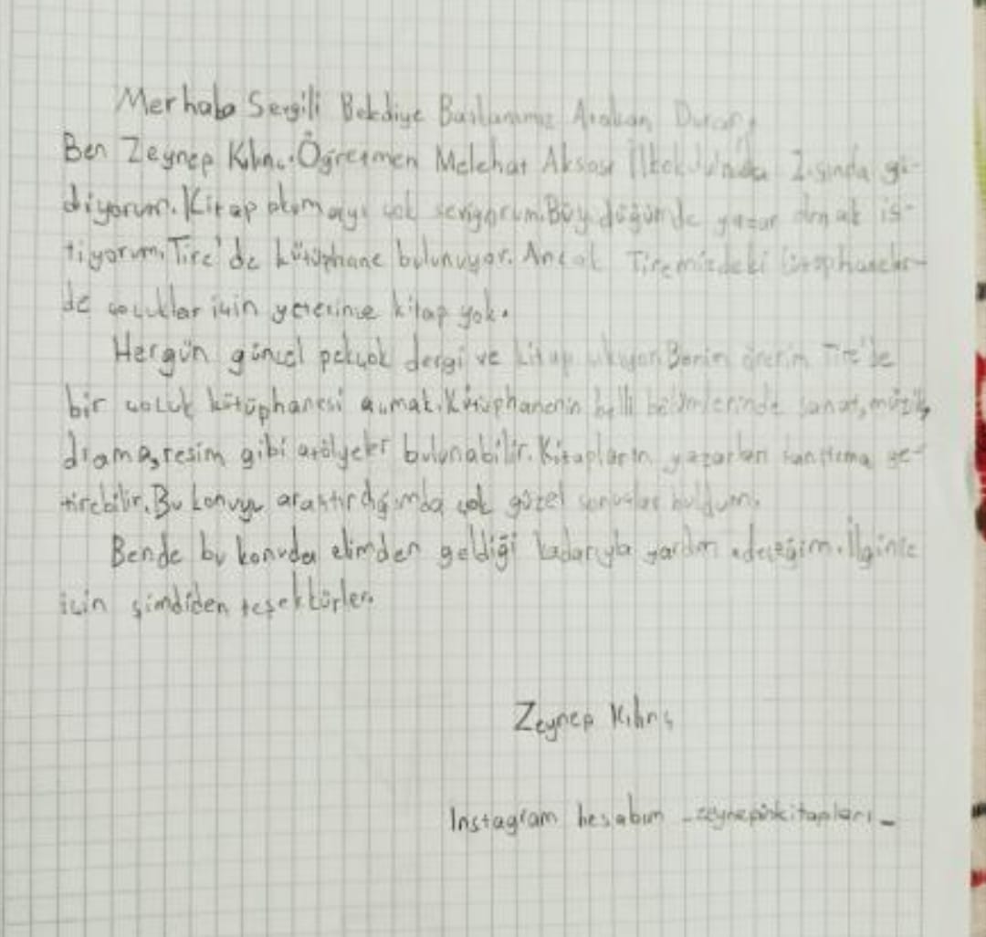 En büyük hedefinin yazar olmak olduğunu ifade eden minik öğrenci Kılınç, mektubunda da yazdığı gibi kütüphanelerde daha çok çocuk kitabı olmasını istedi.