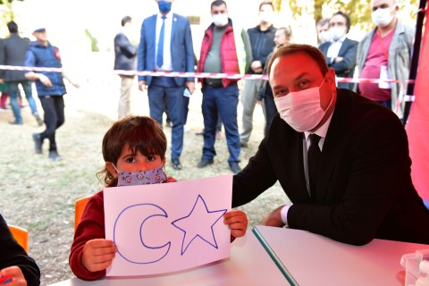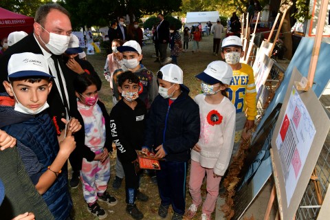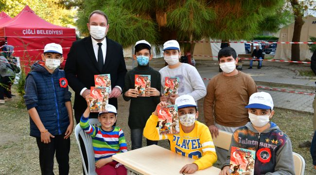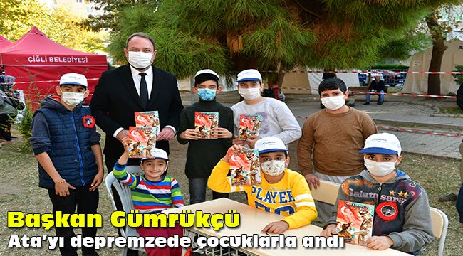 Bayraklı’daki Çadır Kente giden başkan Utku Gümrükçü, çocukların çizdiği ve Çiğli belediyesi Dayanışma çadırında açılan Atatürk Sergisini gezdi. Sergilenen resimlerin hikayelerini tek tek dinledi. Atatürk’ün tarihteki başarılarını uzun uzun anlattı, 10 kasım anısına çocuklara Nutuk hediye etti.