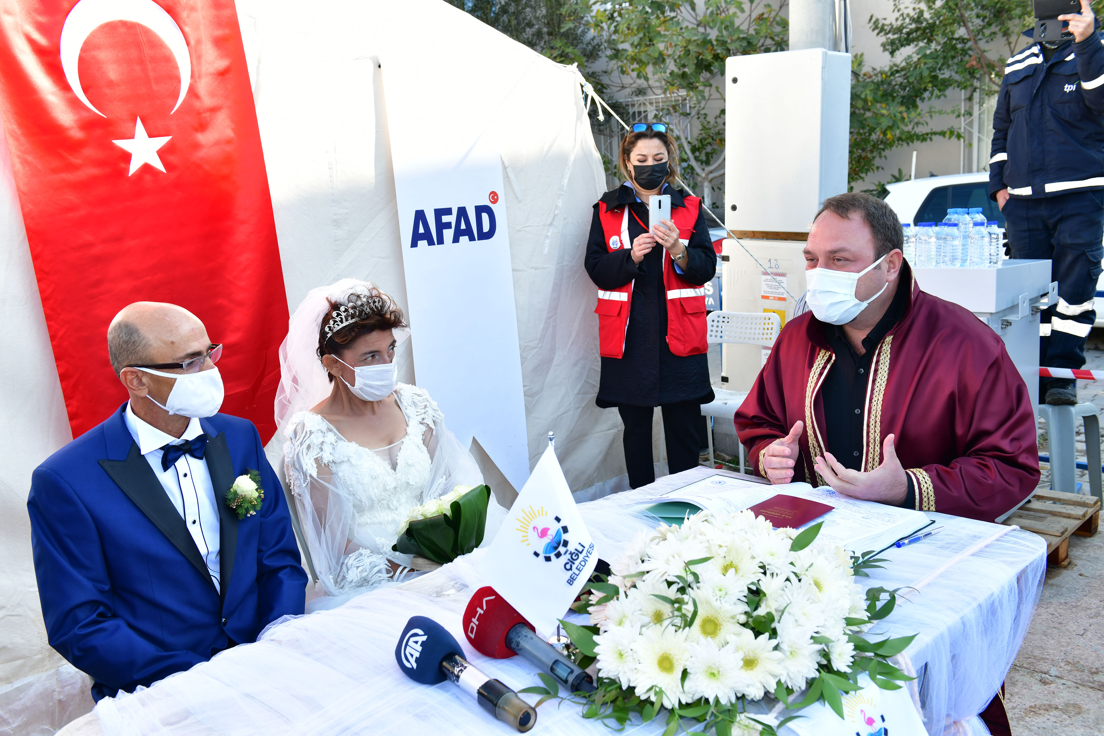 çift, deprem bölgesinde bulunan Çiğli Belediyesi kişisel bakım ekibiyle irtibata geçerek içinde bulundukları durumu iletip, nikah talebinde bulundu. Bunun üzerine Çiğli Belediyesi