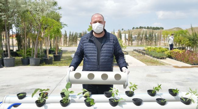 Belediye serasında bitkilerin gelişimini takip eden Başkan Utku Gümrükçü, “Park ve Bahçeler Müdürlüğümüz, saksılarda belirli bitkilerin üretilmesi için topraksız üretim olarak bilinen hidroponik yetiştiricilik sistemini belediye serasında kurdu. Plastik su boruları delindi ve saksılar yerleştirildi. Toprakta yapılan tarımda bitkiler topraktaki azot ve fosfor gibi değerli minerallere kavuşabilmek için toprağın içine doğru büyüyor. Böyle olunca meyve ve sebzenin gelişimi de azalıyor. Üstelik topraklarımızda gerekli mineraller kalmadığı için topraklarımızı sürekli gübreyle desteklemek durumunda kalıyoruz. Topraksız tarım yönteminde ise mineral besin maddeleri suyun içine bir solüsyonla karıştırılarak bitkinin yetiştirilmesi sağlanıyor. Bu sayede bitkiler yüzde elli daha fazla verim veriyor. Bu sistemde akvaryum motoru kullanarak