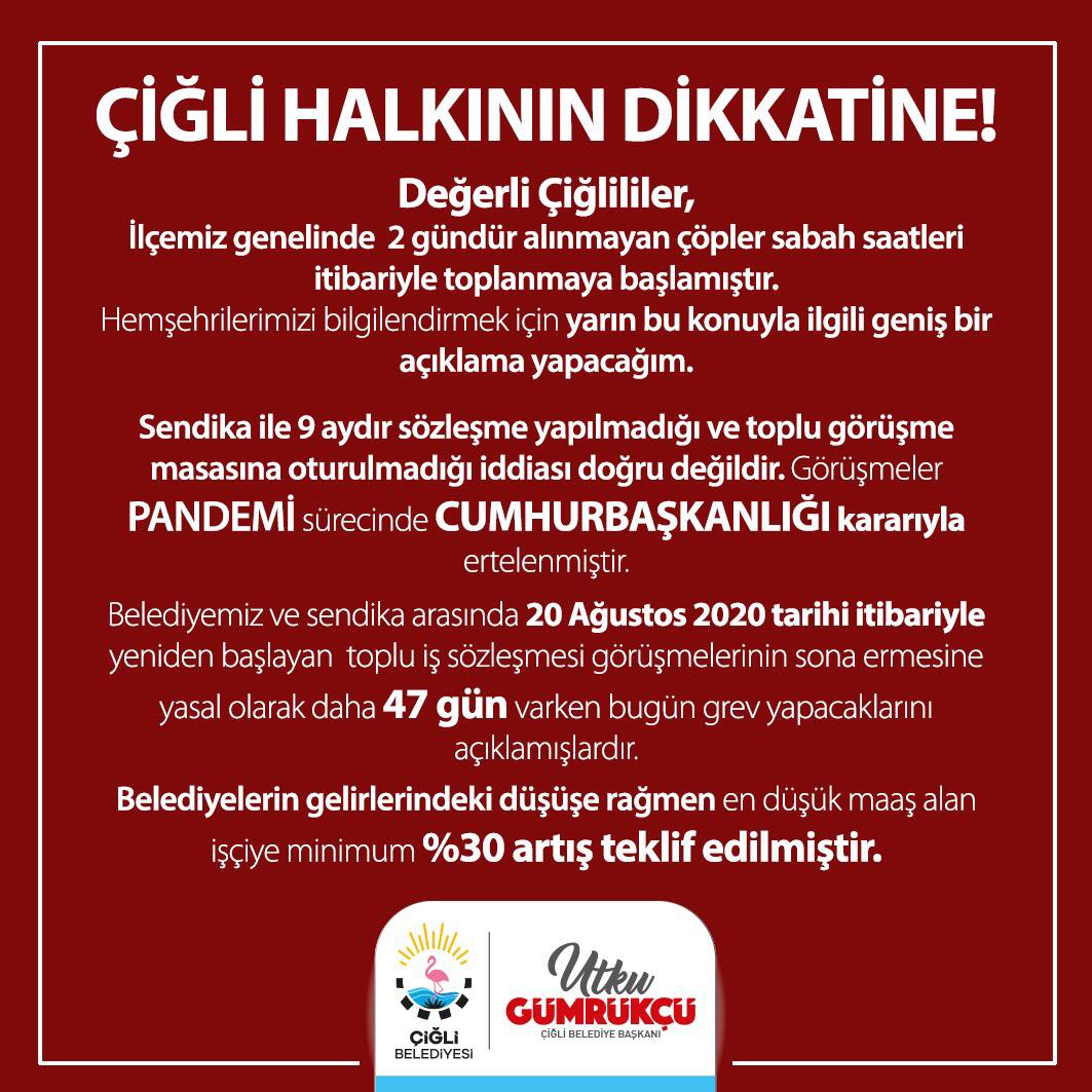 “Değerli Çiğliler, İlçemiz genelinde 2 gündür alınmayan çöpler sabah saatleri itibariyle toplanmaya başlamıştır. Hemşerilerimizi bilgilendirmek için yarın bu konuyla ilgili geniş bir açıklama yapacağım. Sendika ile 9 aydır sözleşme yapılmadığı ve toplu görüşme masasına oturulmadığı iddiası doğru değildir. Görüşmeler pandemi sürecinde Cumhurbaşkanlığı kararıyla ertelenmiştir. Belediyemiz ve sendika arasında 20 Ağustos 2020 tarihi itibariyle yeniden başlayan toplu iş sözleşmesi görüşmelerinin sona ermesine yasal olarak daha 47 gün varken bugün grev yapacaklarını açıklamışlardır. Belediyelerin gelirlerindeki düşüne rağmen en düşük alan işçiye minimum yüzde 30 artış teklif edilmiştir.”